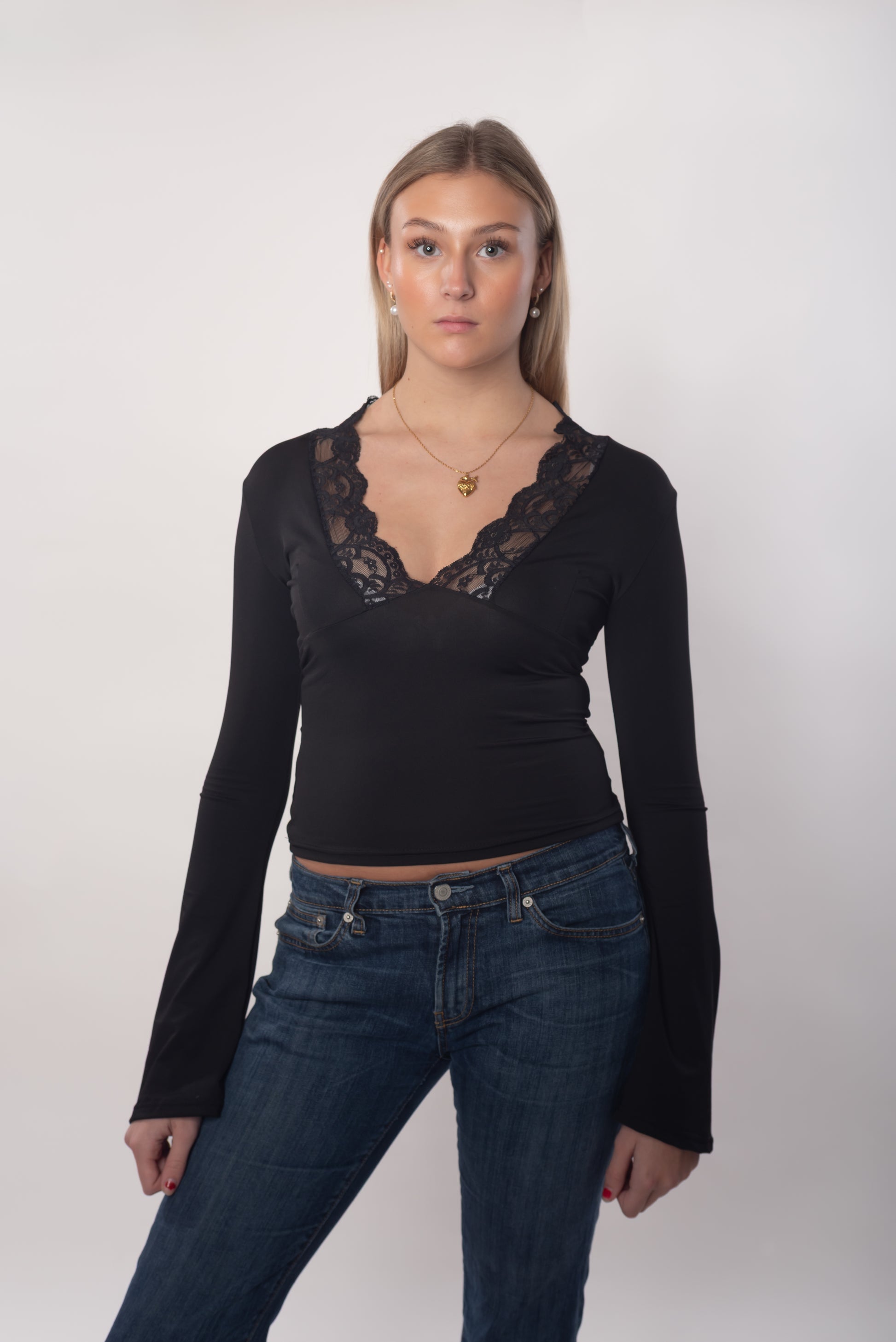 Evelyn shirt med spetskant är både stilren och feminin. Den mjuka, stretchiga kvaliteten gör den bekväm att bära hela dagen, medan spetsdetaljerna ger en fin, sofistikerad touch. En perfekt tröja att enkelt klä upp eller ner beroende på tillfälle!