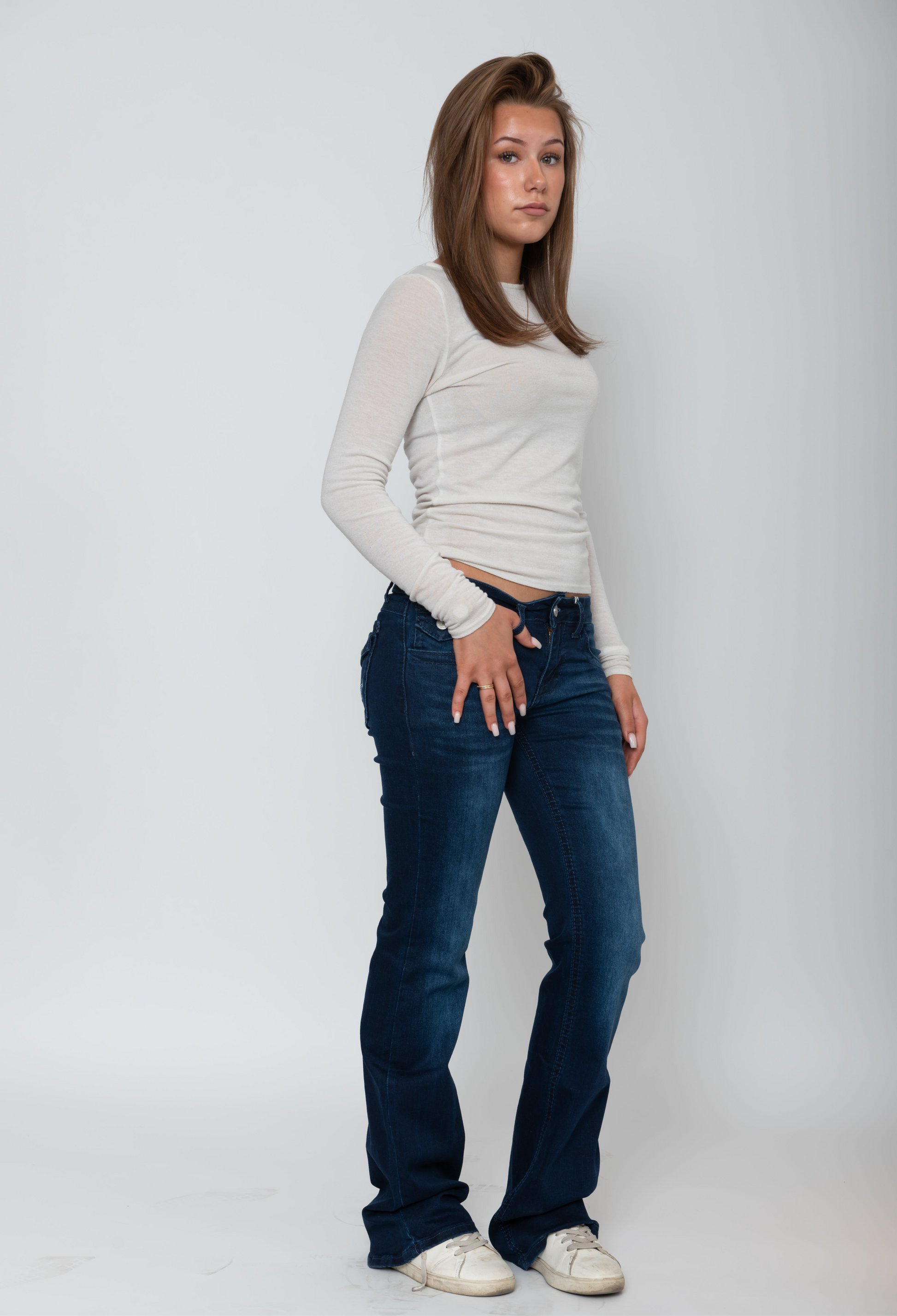 Low-waisted DreamX1 jeans i mörkblått – både bekväma och stiliga. Med ett unikt broderat tryck på bakfickorna blir dessa jeans det perfekta valet för dig som vill ge din vardagslook en extra touch.